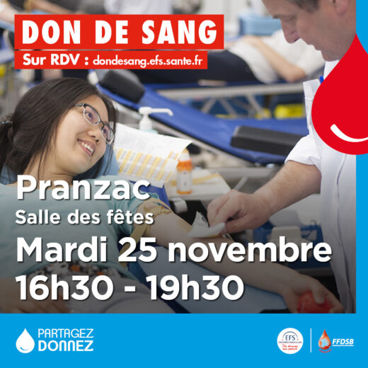 La Mairie informe les habitants qu’une collecte de sang aura lieu le : 📅 Mardi 25 novembre 2025🕓 De 16h30 à 19h30📍 Salle des fêtes de Pranzac (16) Le don de sang est un geste …Lire la suite