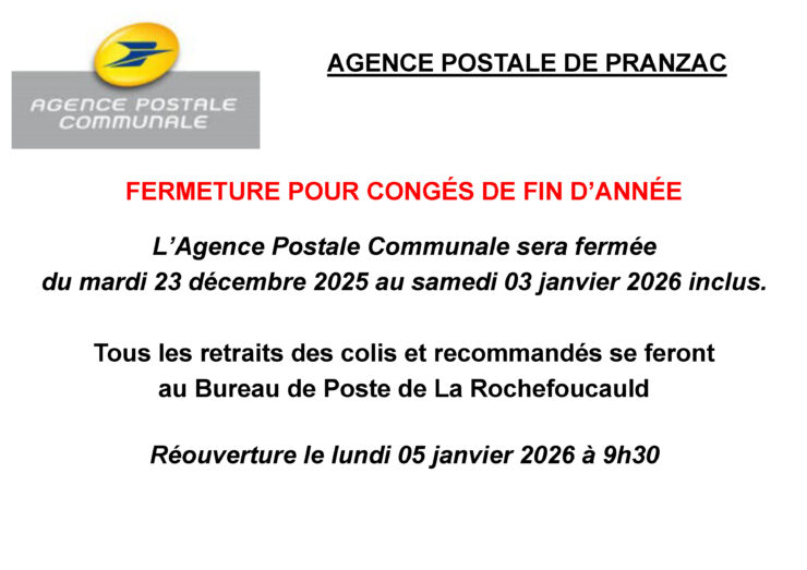 Agence postale de Pranzac – fermeture congés de fin d’année
