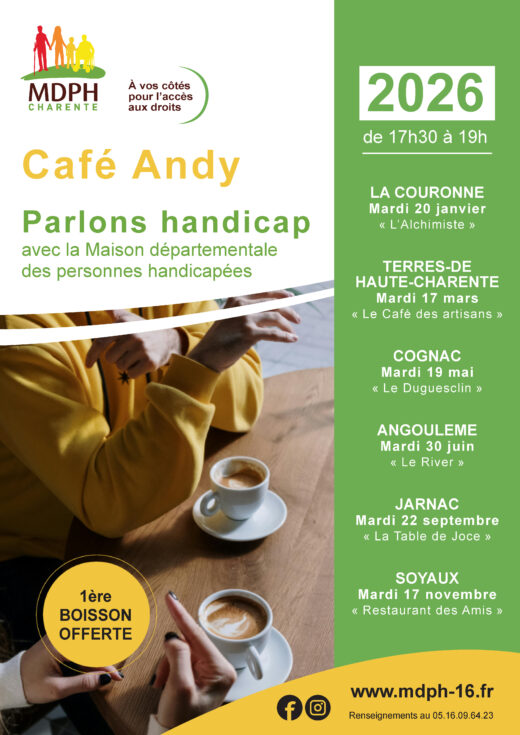 La MDPH renouvelle en 2026 ses Cafés Andy, des moments d’échanges conviviaux au plus près des Charentaises et des Charentais.Ces rencontres sont ouvertes à toute personne en situation de handicap ainsi qu’à ses aidants. Organisés …Lire la suite