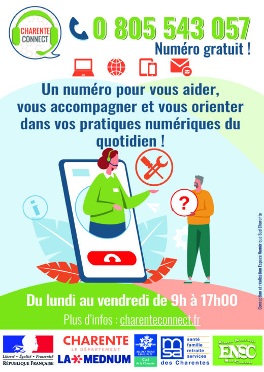 Numéro gratuit ! 0805 543 057 CHARENTE CONNECT Un numéro pour vous aider, vous accompagner et vous orienter dans vos pratiques numériques du quotidien ! Du lundi au vendredi de 9h à 17h00 Plus d’infos …Lire la suite