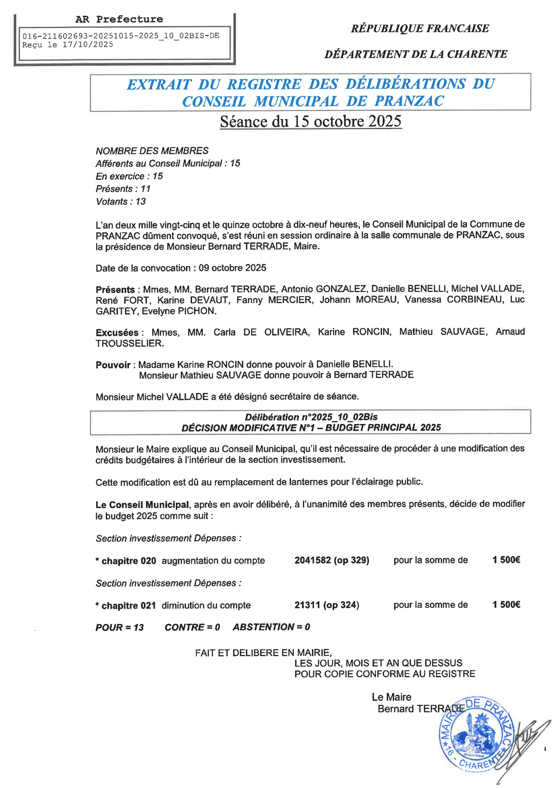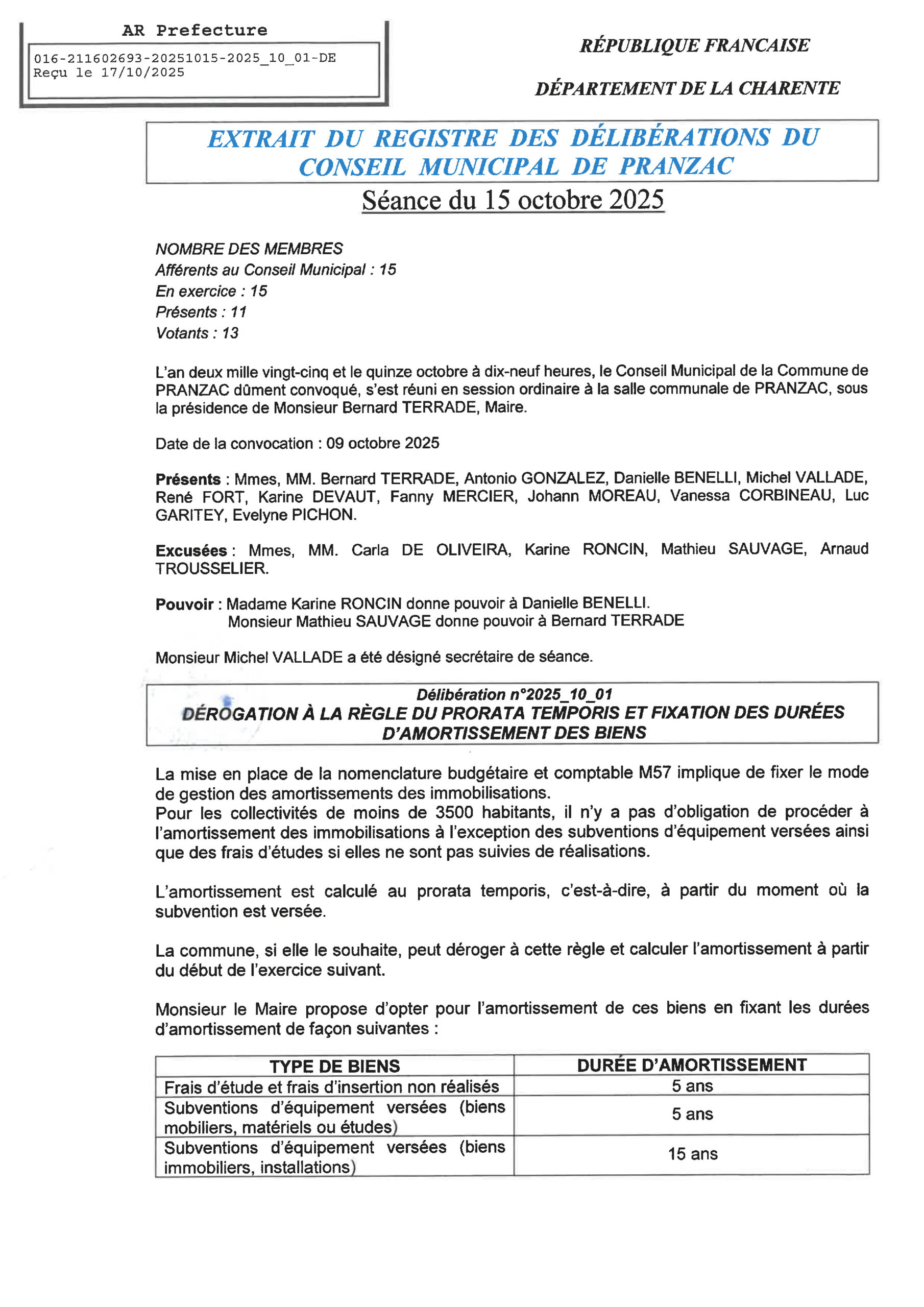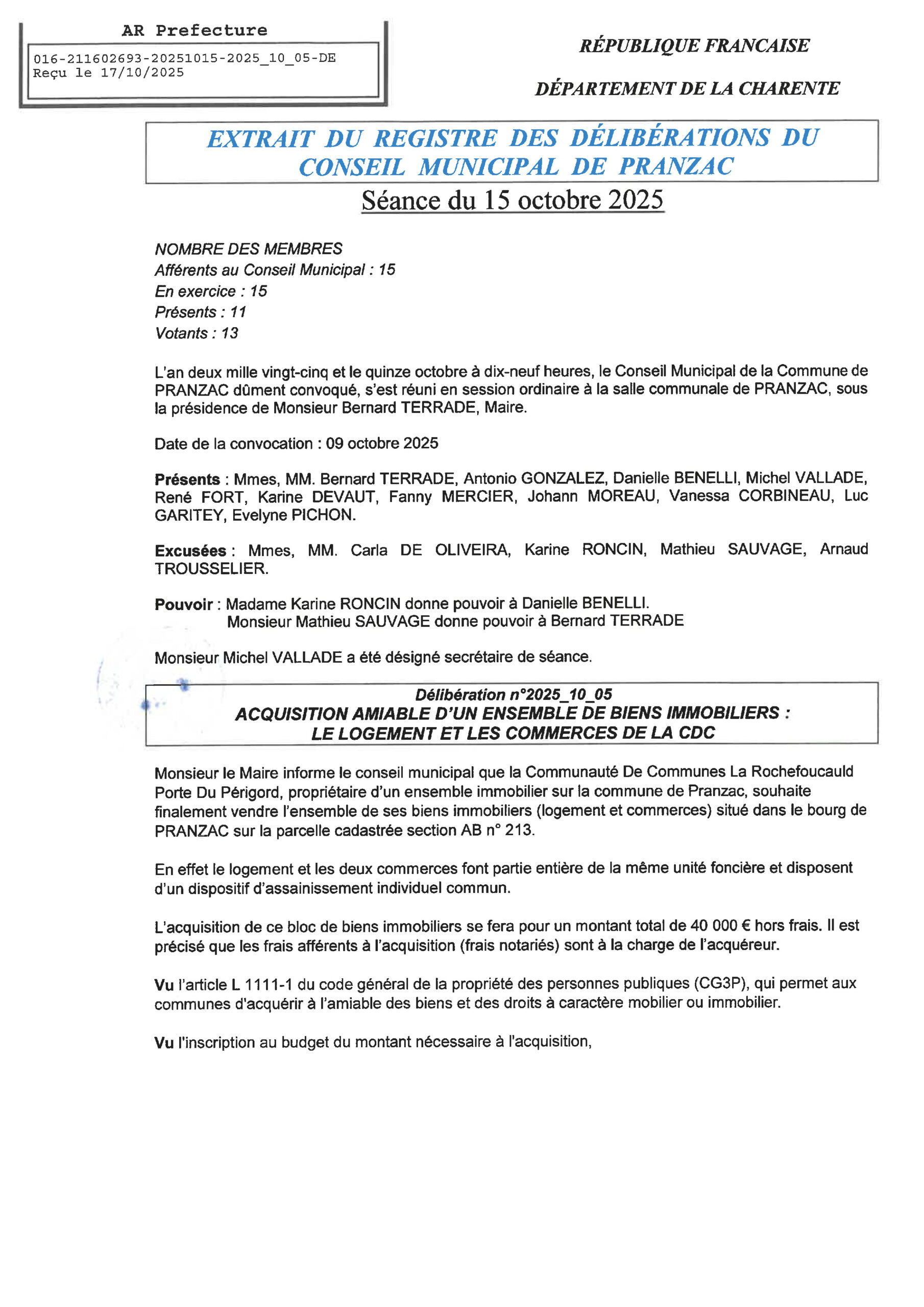 Délibération du conseil municipal de la séance du 15 octobre 2025