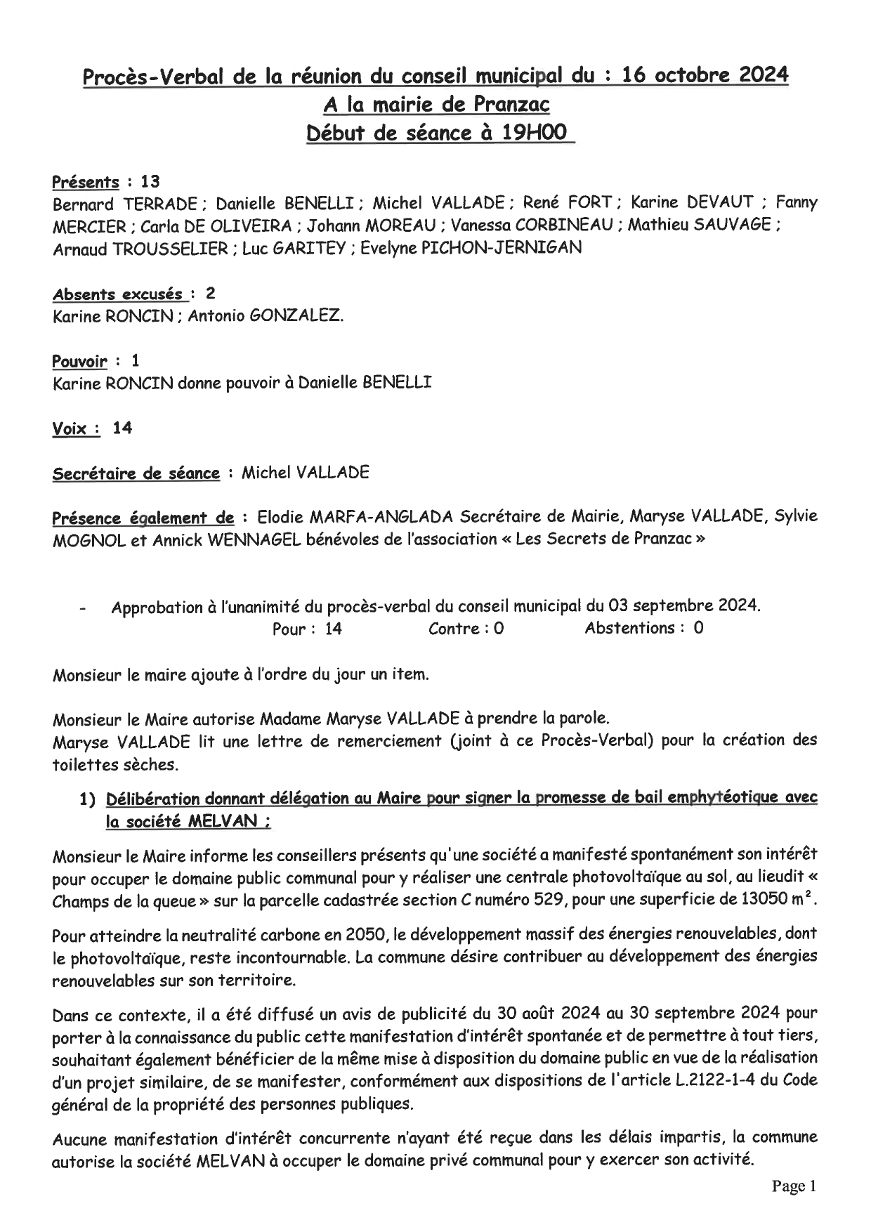 Procès-Verbal de la réunion du conseil municipal du 16 octobre 2024