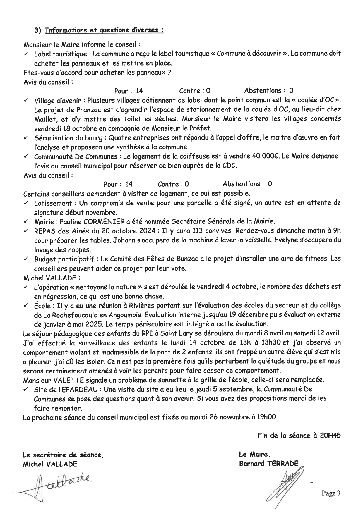 Procès-Verbal de la réunion du conseil municipal du 26 novembre 2024
