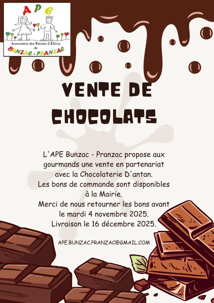 L’Association des Parents d’Élèves de Bunzac-Pranzac (APE), en partenariat avec la Chocolaterie d’Antan, organise une vente de chocolats de Noël.